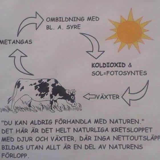 Man måste ta hänsyn till kolcykeln. Det gräs korna äter, tar upp lika mycket kol som korna sedan ger ifrån sig. Men det gräs som inte äts av kor, ger också ifrån sig koldioxid.