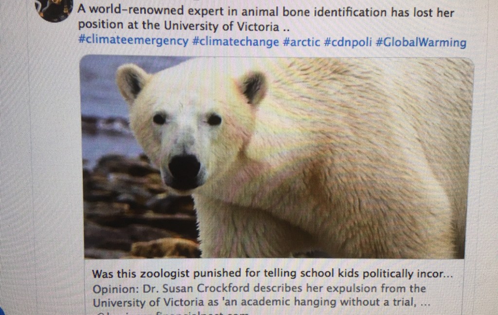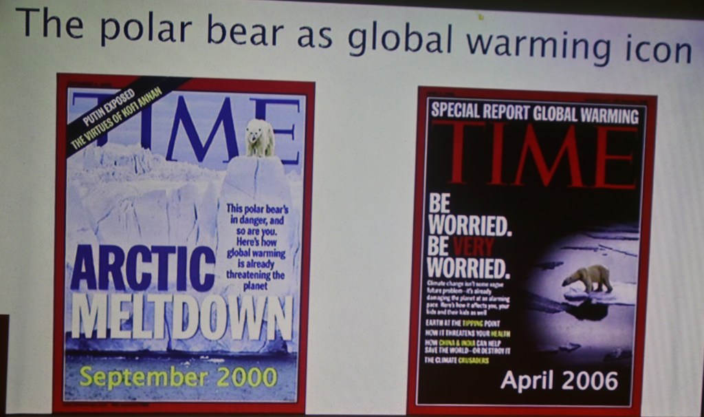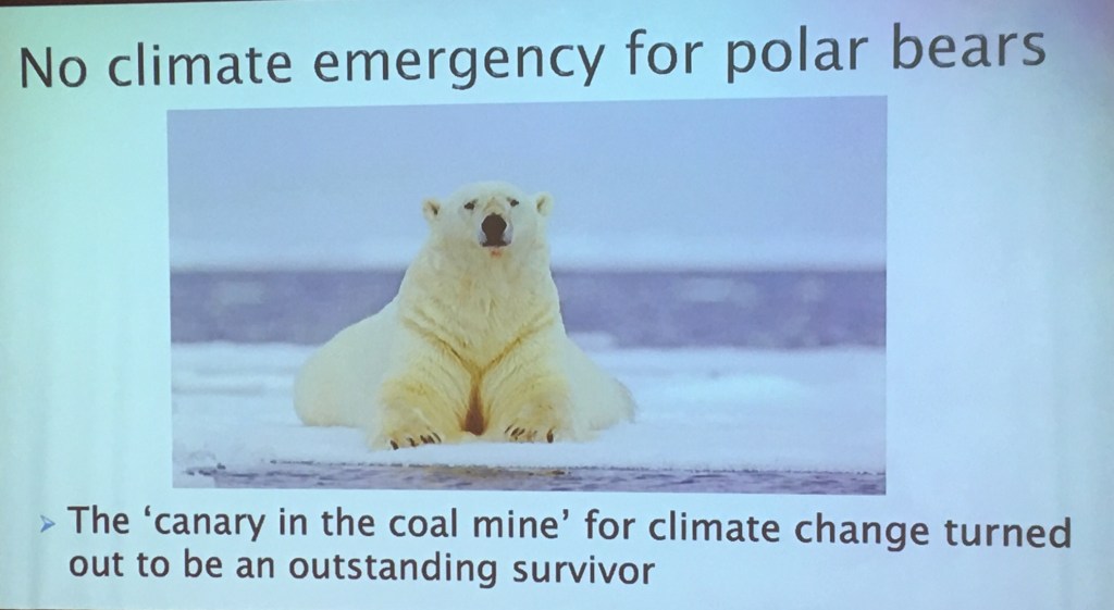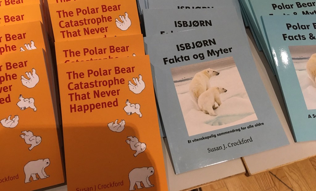 Ett mycket intressant inslag i konferensen är när ”världskändisen” Susan Crockford berättar om forskningen om isbjörnar i Arktis. Hon har arbetat inom zoologi i 35 år, varav 15 år med isbjörnar vid Victoria University i Kanada. Hon är en av världens främsta experter på isbjörnar och har under senare år varit adjungerad professor vid universitetet.
