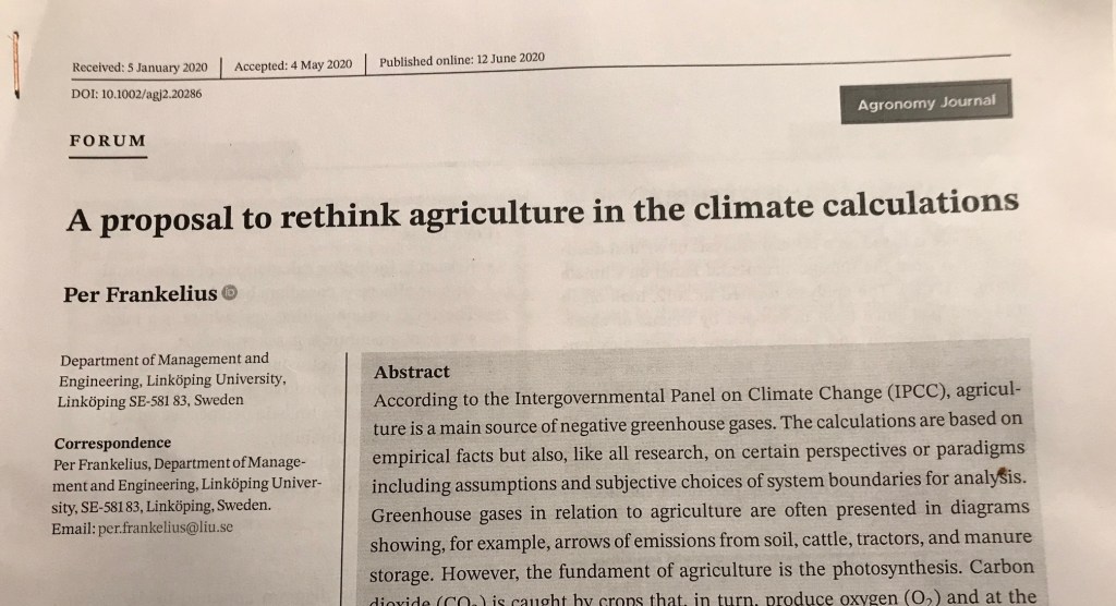”Den negativa syn på jordbruket som blivit en följd av myndigheternas beräkningsmetoder måste redas ut”, skriver miljöexperten Göran Värmby i Veckans krönika. Jordbruket är en kolsänka. Jordbruket tar upp mer koldioxid än man släpper ut. Hur kan det komma sig att IPCC missat detta, undrar Göran Värmby. Enligt forskaren Per Frankelius handlar det om inställning, IPCC är enbart fokuserade på utsläpp.”Ett viktigt påpekande är att IPCC tar in och sammanställer forskning från olika universitet och forskningsinstitut. De bedriver alltså inte någon egen forskning”, skriver Göran Värmby. Beräkningsmetoderna har missgynnat jordbruket, och lett till den negativa syn på jordbruket. Myndigheternas beräkningsmetoder måste därför redas ut. I synnerhet som pandemin blottat brister i Sveriges beredskap med låg självförsörjning ifråga om livsmedel.