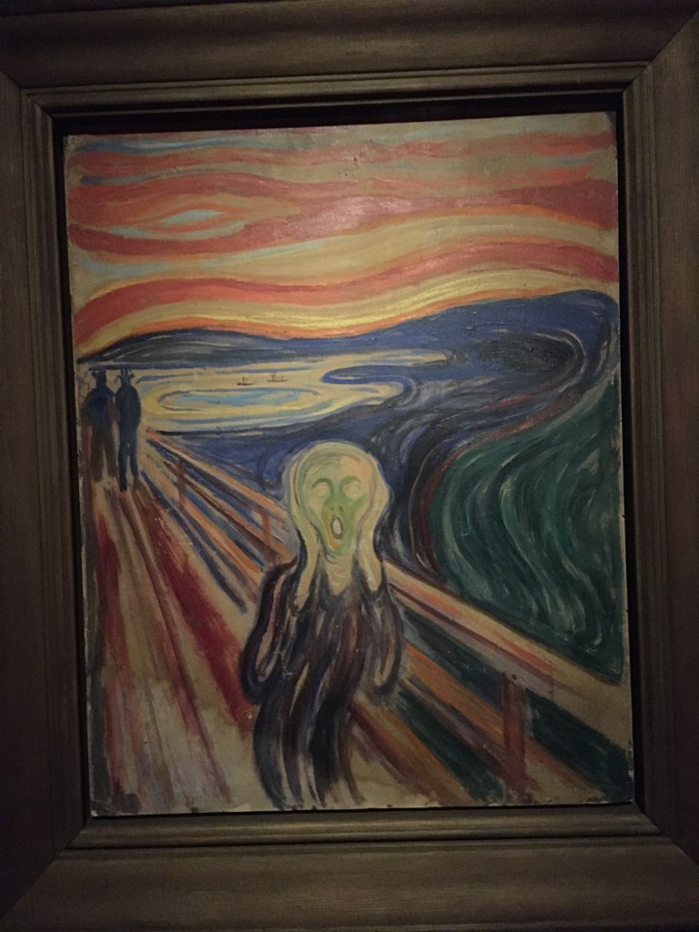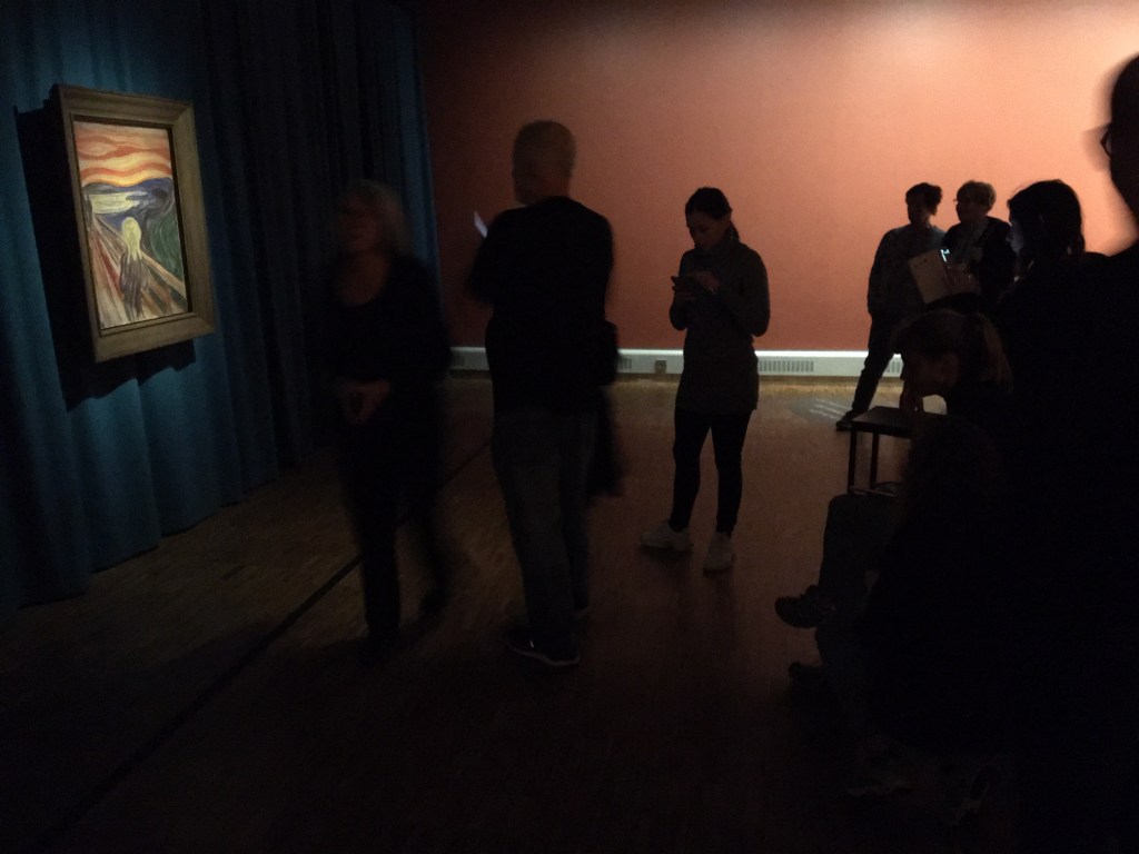 Det är trångt i museet. Störst trängsel är det i rummet där Skriet hänger. En och en går besökarna fram och tar en bild på målningen med sina mobiltelefoner. Några vill själva vara med på bilden. En ”selfie” med Skriet. En ”selfie” med ångest. Vakterna övervakar att ingen går för nära tavlan.